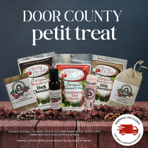 Description Door County Petit Treat Gift Box is filled with all the De-Liteful Door County treats from Country Ovens. A perfect gift to cover everyone in the family all packaged in a Cherry De-Lite Gift Box. Door County Petit Treat Gift Box Includes; 1, 2 oz - Dried Tart Cherries 1, 2 oz - Milk Chocolate Covered Dried Cherries 1, 2 oz - Dark Chocolate Covered Dried Cherries 1, 2 oz Cherry Hand Lotion 1, Bar of Cherry Soap 1, Cherry Chapstick 1, Cherry Bathsalts Shipping, Gift Bag and Custom Message all Included in our Gift Box Bundle. One Gift Box per Order.