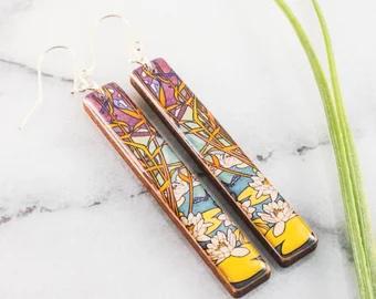 Classic, yet statement making, these timeless earrings are made from sustainably harvested hardwood, handmade paper sourced from Europe, and a glossy vegetable- based (BPA/VOC free) resin coat. Handcrafted sterling silver ear wires. Please note, paper pattern placement will vary. Approximately 3.5 inches long x .5 inch