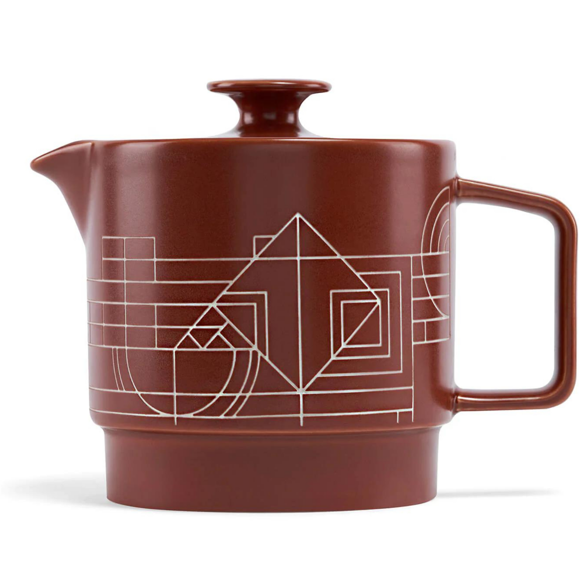 The Terra 20-ounce sienna stoneware teapot with gold loose tea infuser showcases one of Frank Lloyd Wright’s original designs etched into the cup's surface, capturing the essence of Frank Lloyd Wright’s design principles and his relationship with nature. This unique collaboration with the Frank Lloyd Wright Foundation is rooted in tradition and celebrates creativity that inspires connections to nature, beauty, and each other.Pairs perfectly with the Terra Teacup and Saucer.Measurements and Details:Steeps 20 ouncesIncludes stoneware lid and gold infuser basketTeapot measures 4.4L x 6.6D x 4.6H"Gold infuser basket measures 3.1L x 3.1D x 2.5H"Stoneware teapot and lid are microwave & dishwasher safeInfuser basket is dishwasher safe, do not microwave