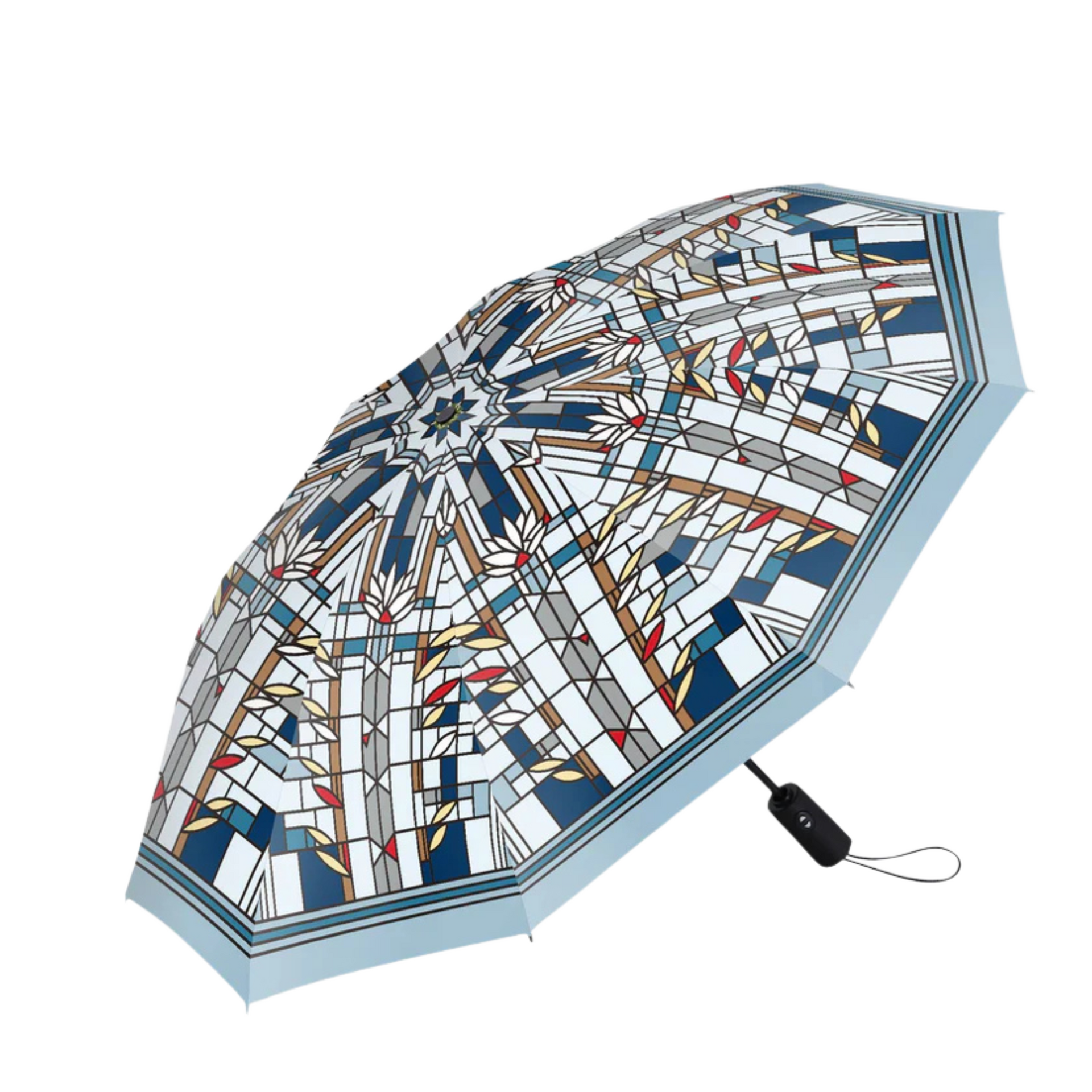 This pattern is based on Frank Lloyd Wright's Waterlilies design.Premium QualityAutomatic Open and CloseWindproof and RainproofUnbreakable rust-free aluminum and fiberglass composite frame44" ArcIncludes secure elastic wrist strap and cover to keep the car or bag dry11" long for compact travel