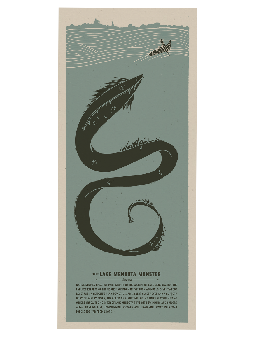 Original Illustration by Mike BassDigital print on 80lb cover archival stockDimensions 8x19 inches - At times playful, and at others cruel, the monster of lake Mendota toys with swimmers and sailors alike. Tickeling feet, overturning vessels and snatching away pets who paddle too far from shore.